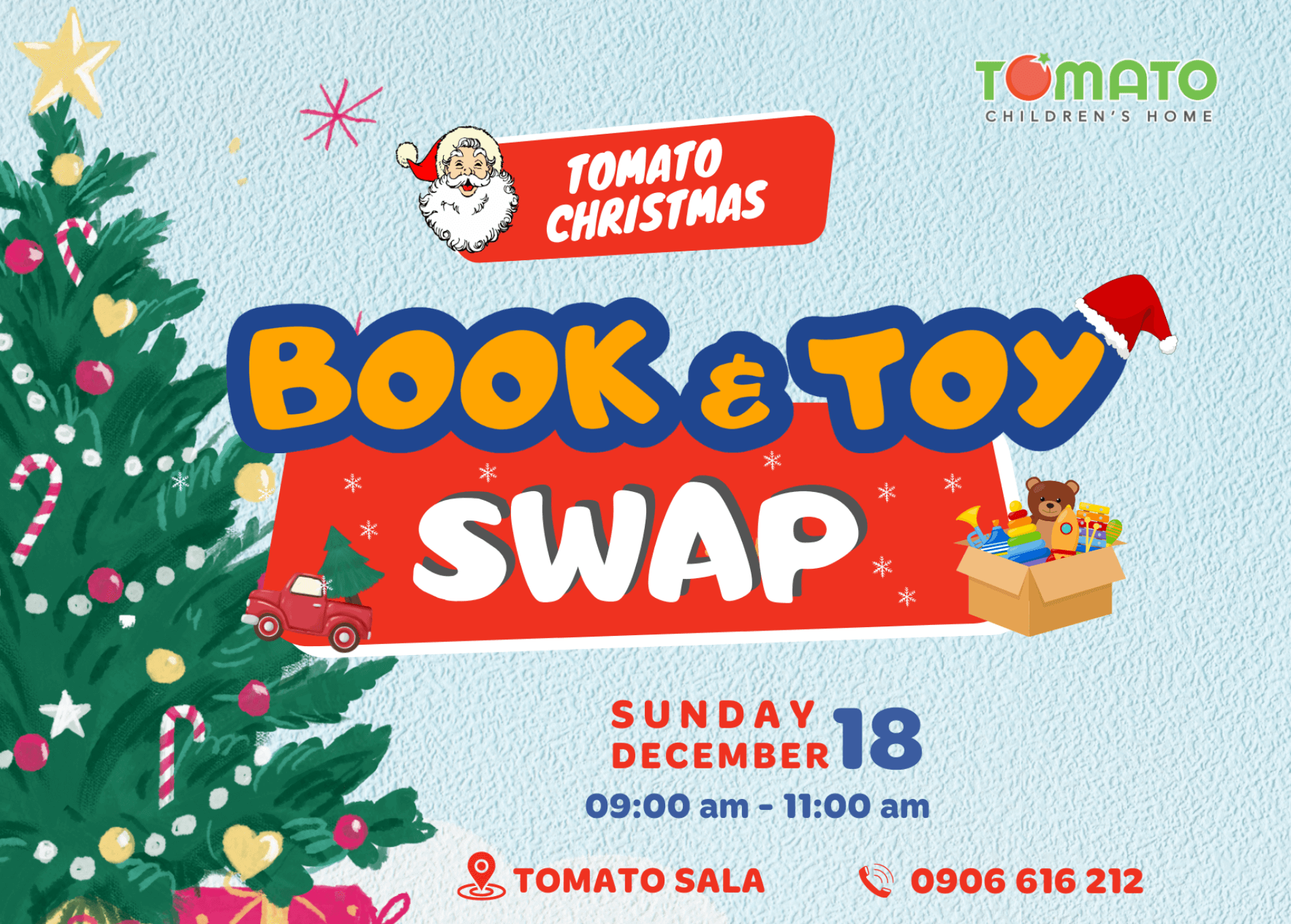 Hội chợ Trao đổi đồ chơi và sách - “Book & Toy Swap” được tổ chức bởi TOMATO Children’s Home là dịp các bé có thể đem đồ chơi hoặc những cuốn sách đã đọc của mình đổi lấy một món đồ chơi yêu thích và những cuốn sách hay khác. Với rất nhiều góc hoạt động thú vị và vui chơi bổ ích tại sự kiện, các bé sẽ ý thức được trách nhiệm với môi trường và giảm lãng phí, biết tiết kiệm, yêu thương và cho đi.